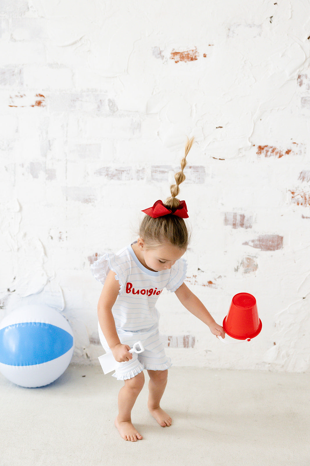 Good mornings just got cuter! This adorable set features a ruffle-sleeved shirt with cheerful red buongiorno lettering and soft blue and white striped shorts for a perfectly playful look. Made from breathable, ultra-soft Pima cotton, it's designed to keep little ones cool, comfy, and ready to take on sunny days in style. Whether it's breakfast al fresco or a stroll through the park, this outfit is full of feel-good vibes and Italian charm!