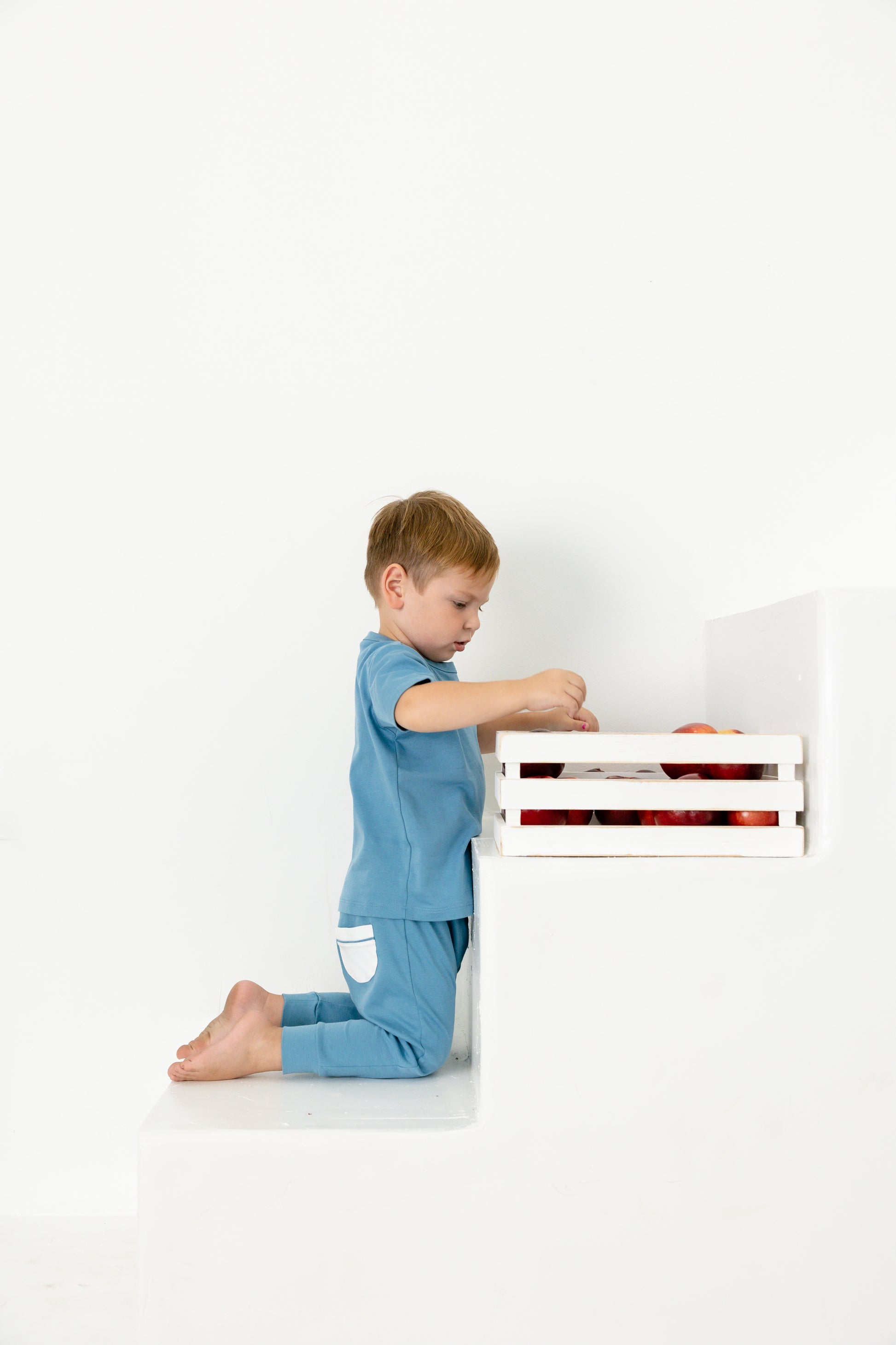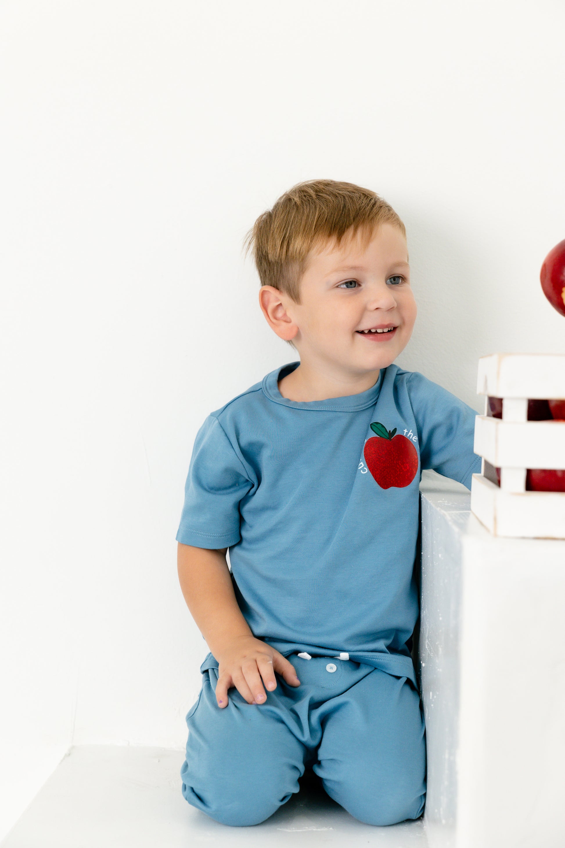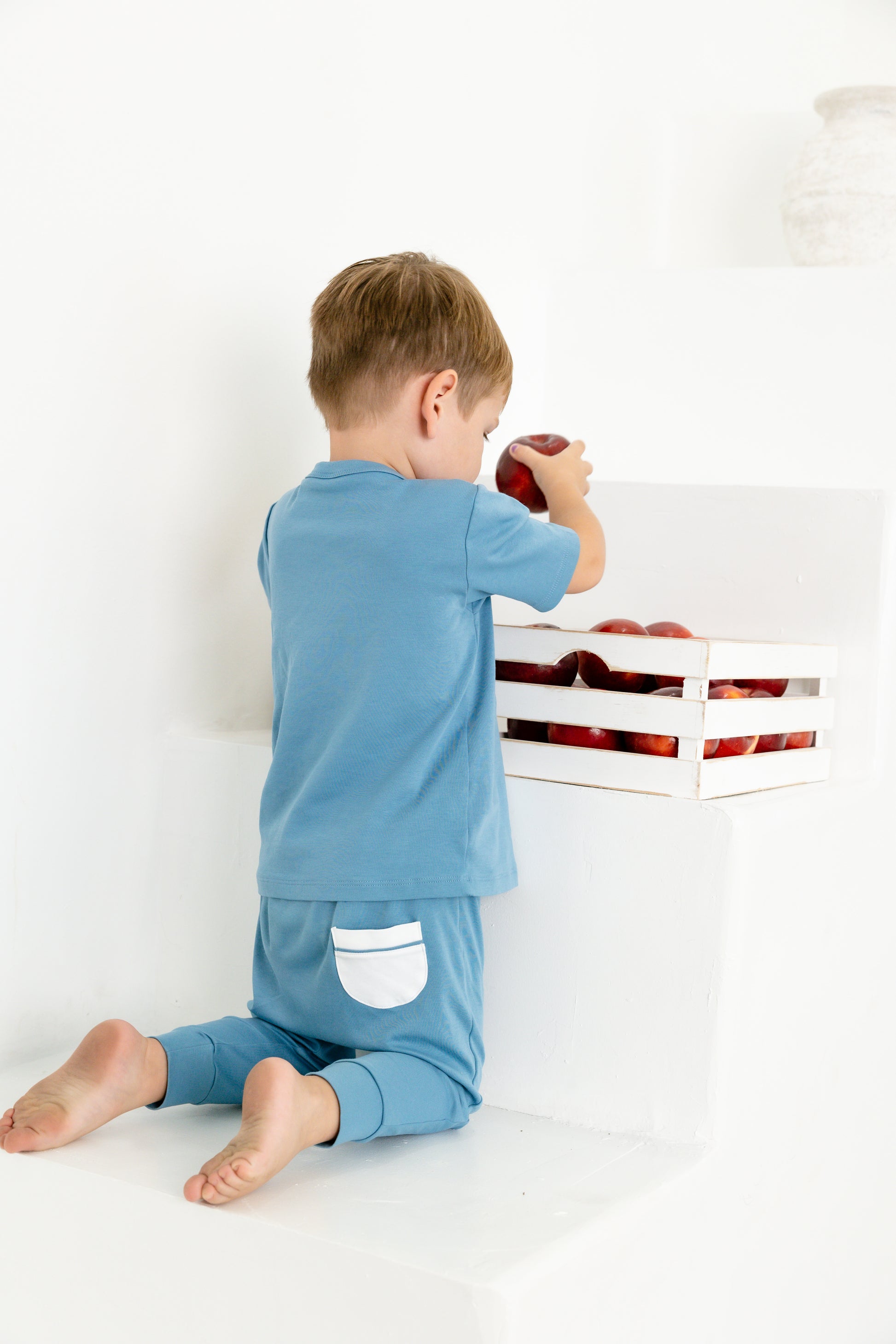 This 100% Pima Cotton Jogger is perfect to match with our cute to the core t shirt. It has two white buttons with a non- functional drawstring on the front. It also has the cutest pocket on the right back side with contrast piping.