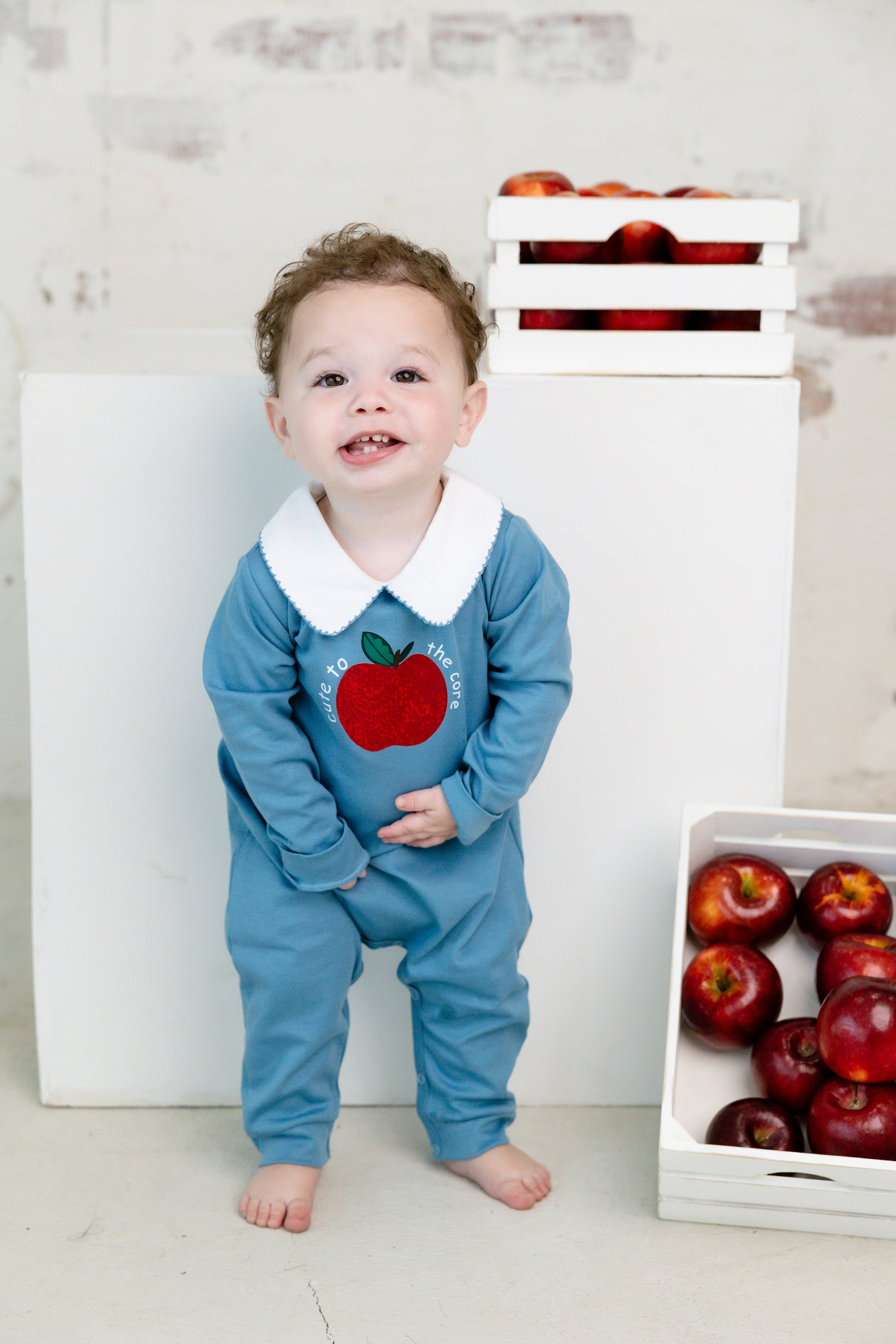 This 100% Pima Cotton " Cute to the Core " playsuit is perfect for babies 24 months and under. Has two snaps on the back along with snaps on the bottom for easy over the head access. It also has matching niagara pipping along the collar. If you have kids under 6 it is perfect to have them all matching in our cute to the core collection.
