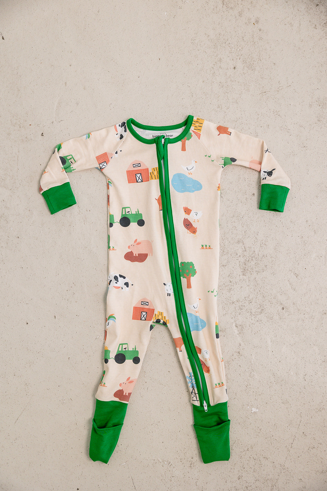 Snuggle your little cub in our adorable farm print sleeper, where sleepy cows, fluffy sheep, and playful piglets dance through cozy dreams. Made with love and the softest fabric, it's perfect for barnyard bedtime cuddles.