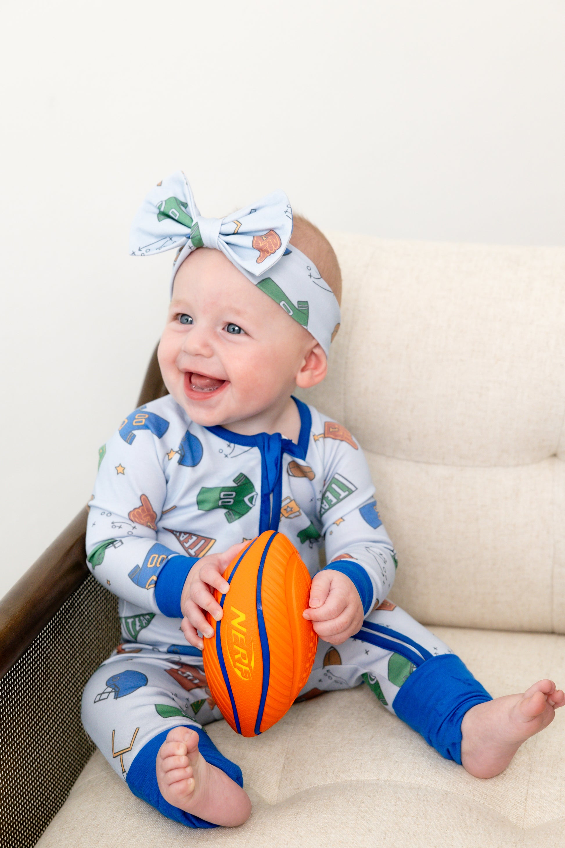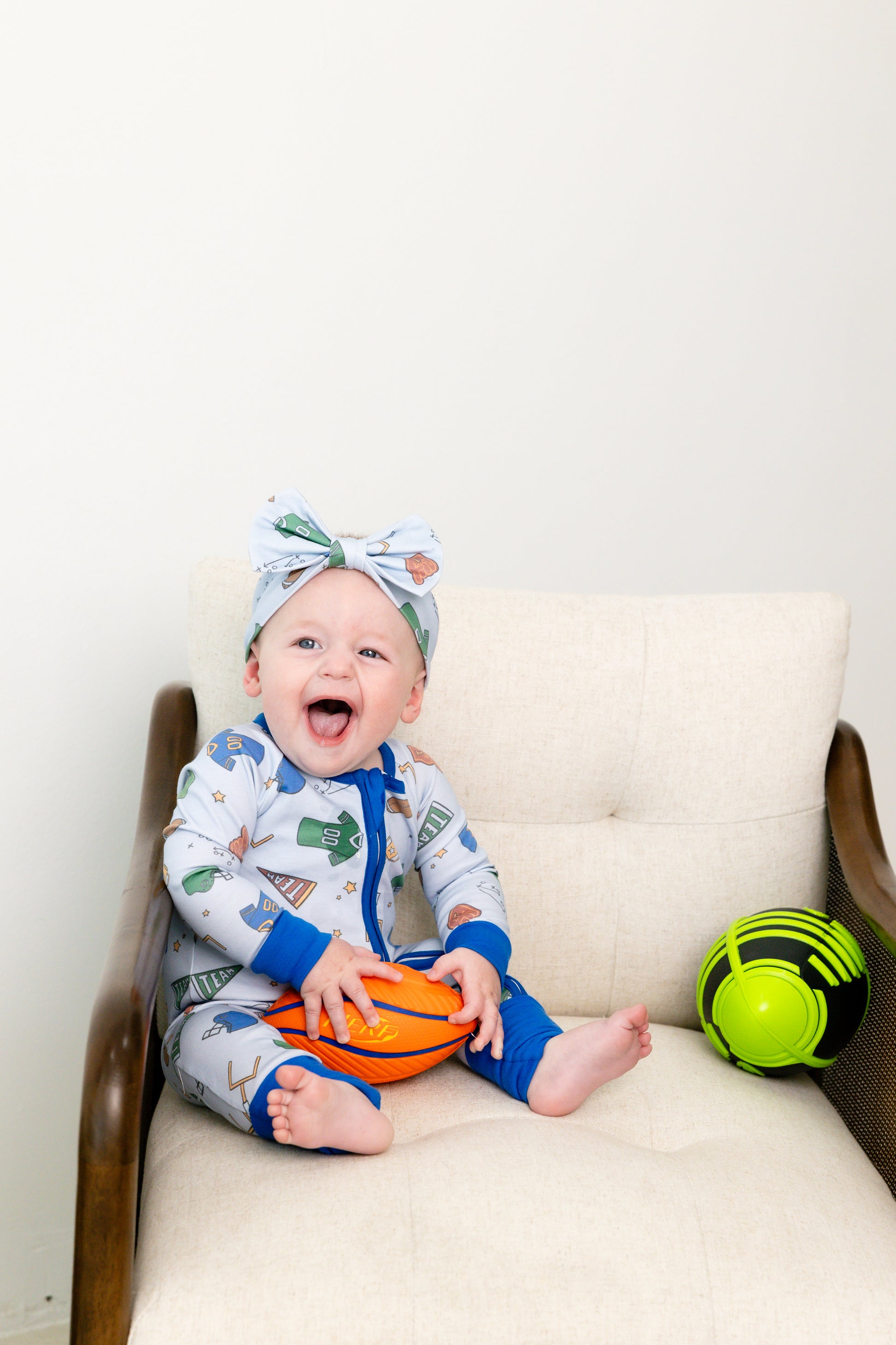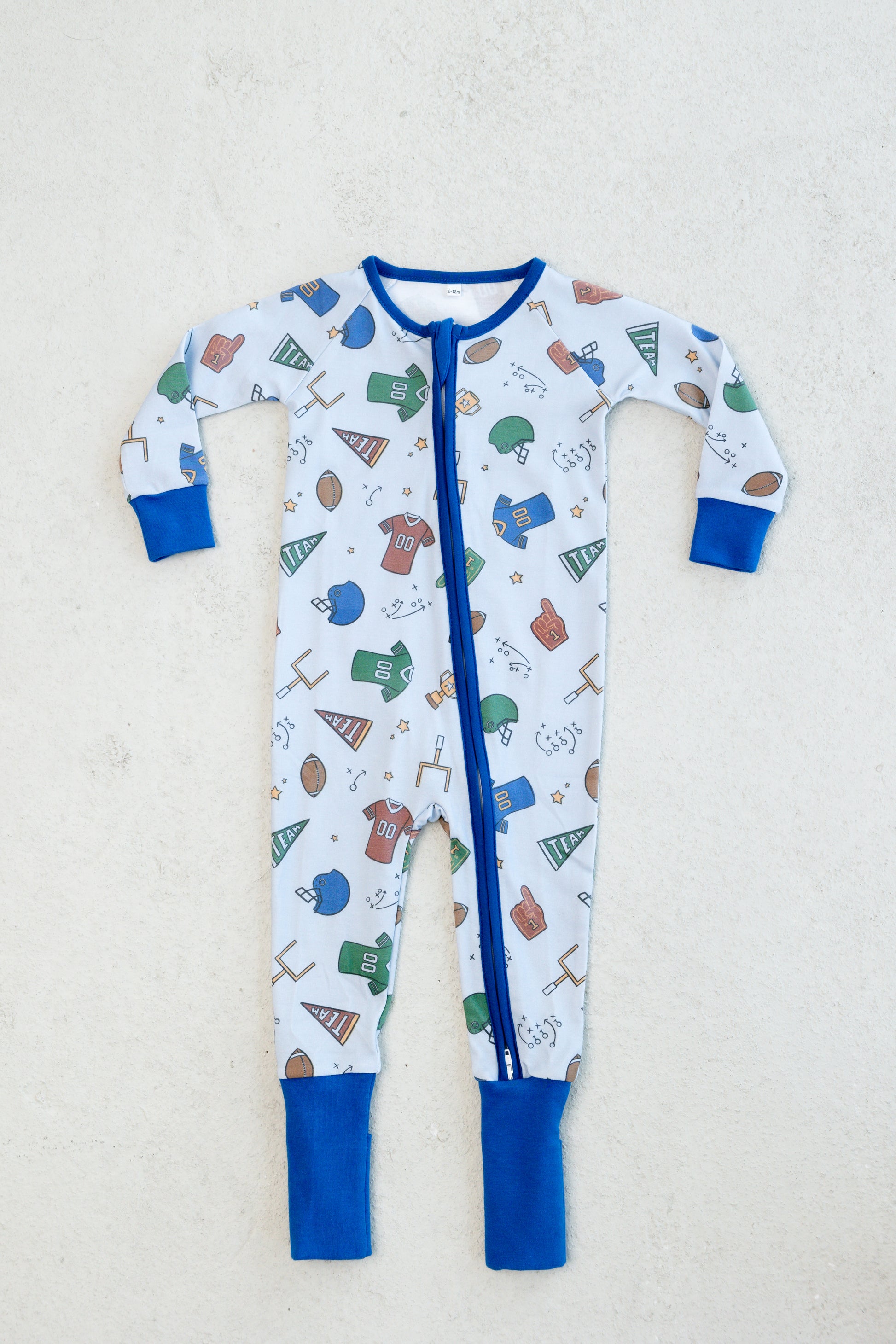 This game day sleeper is crafted with the softest Pima cotton for your little one's ultimate comfort! Wrap your bundle of joy in a cloud of luxury with our ultra-breathable, hypoallergenic fabric that's gentle on delicate skin. Perfect for playtime adventures or dreamy nap sessions, this zip sleepy is designed to keep your baby snug and stylish all day long.
