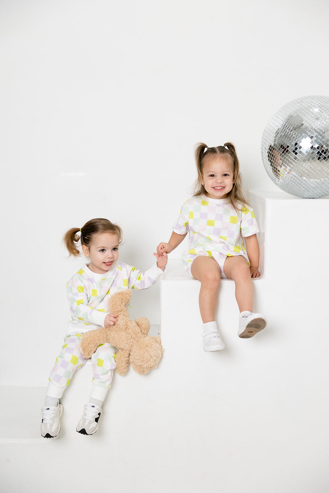 Keep it cute, cozy, and colorful with our Multi-Colored Checkered French Terry Pima Cotton Jogger Set! Made from luxuriously soft Pima cotton, this set is perfect for little ones who love to move, play, and lounge in total comfort. The vibrant checkered print adds a fun pop of color, while the French terry fabric keeps things breathable and oh-so-snuggly.