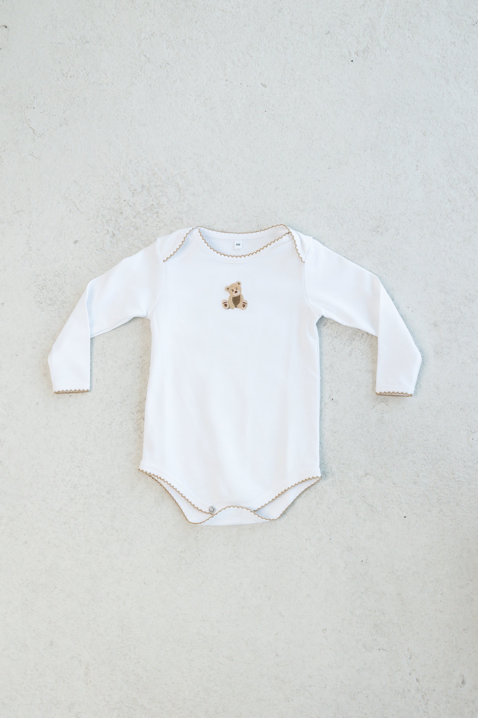This embroidered teddy bear long sleeve body suit is crafted with the softest Pima cotton for your little one's ultimate comfort! It has brown picot trim around the collar. Perfect for by itself or paired with one of our joggers.